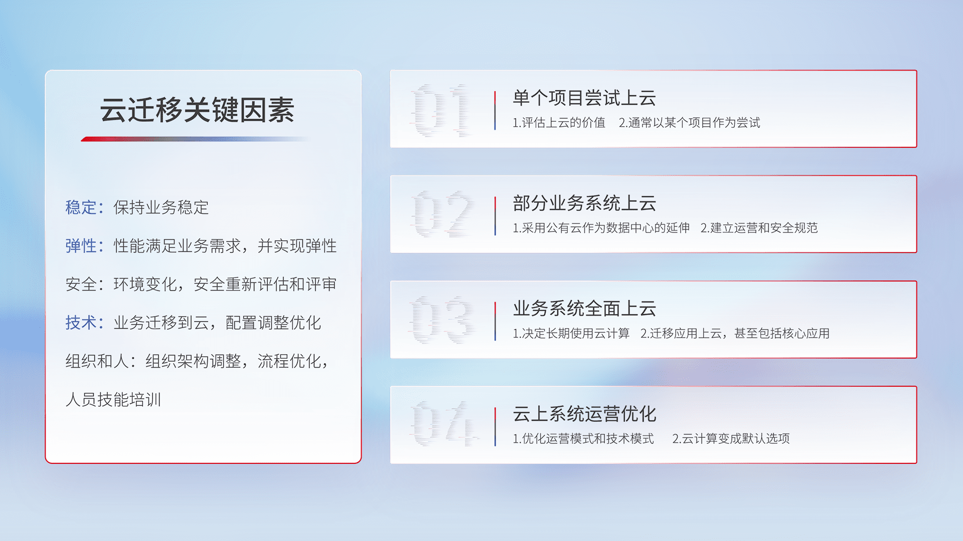 结合实际业务,,,从规划设计、、、云平台选型、、、、云原生改造、、、、数据迁移、、、、集成交付,,,迁移全过程为客户识别最佳上云路径,,,,做好风险识别管理,,设计网络架构、、身份权限、、、、安全审计合规、、操作审计、、、、日志审计、、监控告警策略、、、、多站点容灾设计等,,,对云上基础设施进行整体规划,,提升IT治理水平,,,以满足弹性、、、、高可用、、、、高性能的需求。。