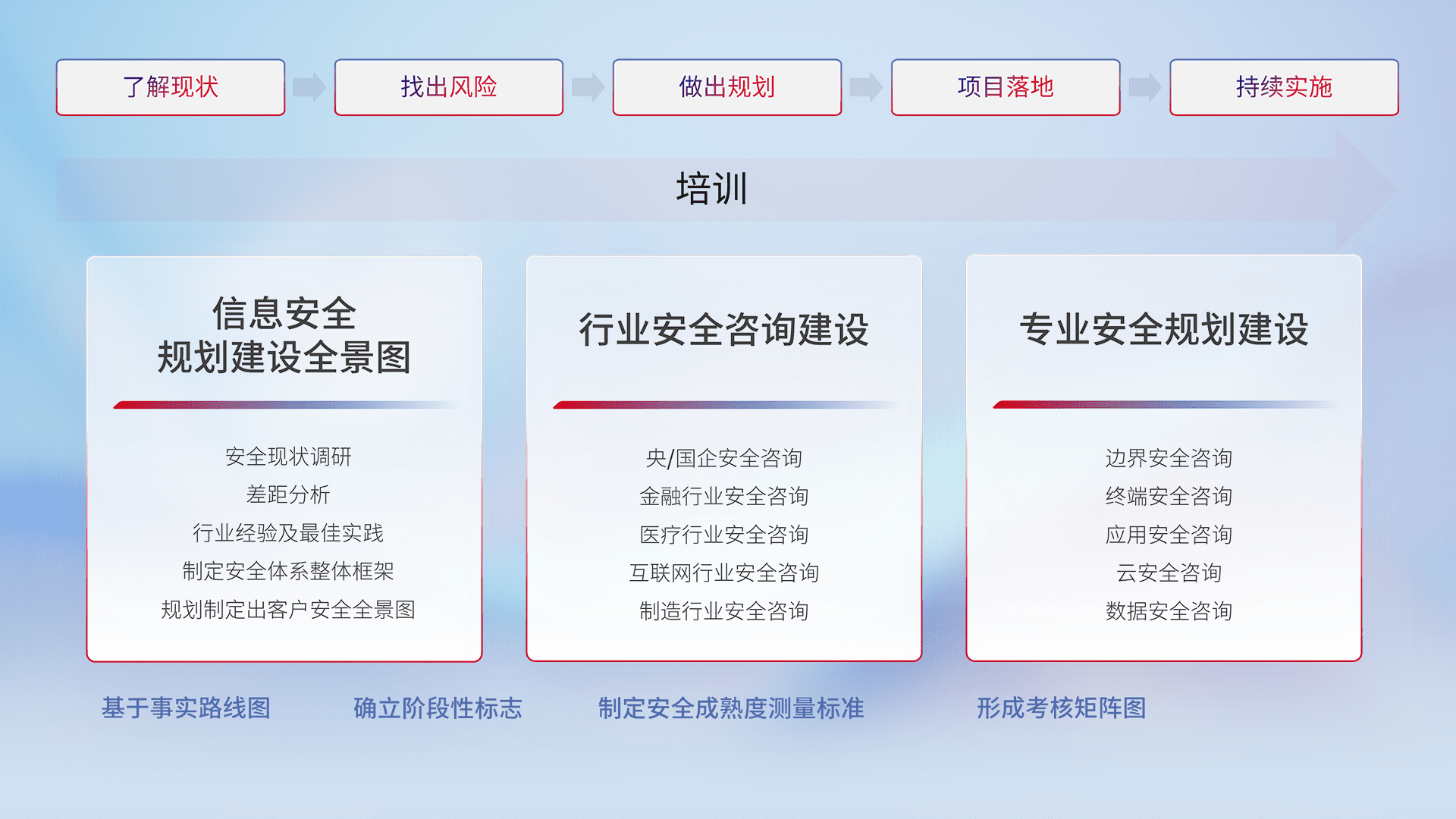 梳理客户信息安全现状调研、、差距分析结果,,,,结合行业先进经验及最佳实践,,,制订客户的信息安全管控体系总结架构,,,最终形成一个完整的客户信息安全规划与建设的全景图。。