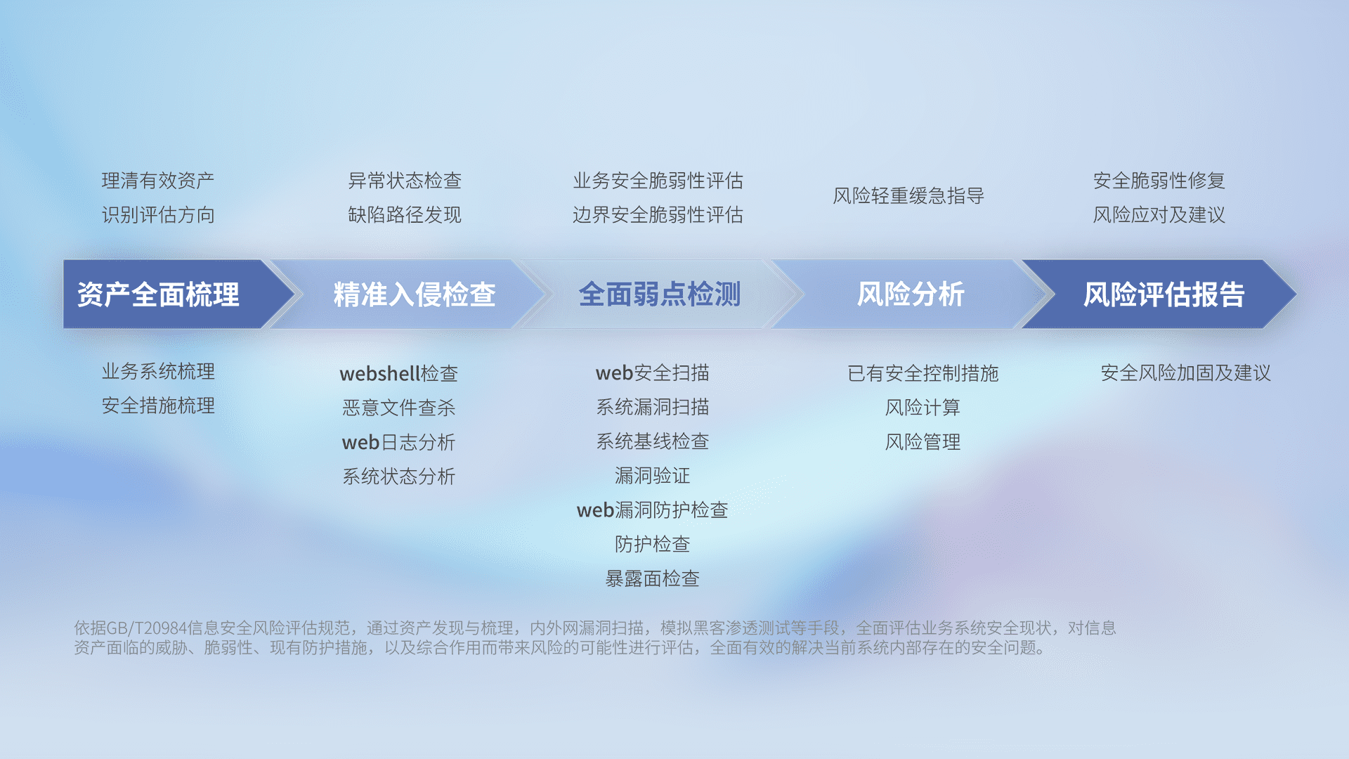 针对客户行业特性,,,,以专业的安全服务+多厂商联合解决方案提供专属的一站式安全管理服务,,,帮助客户全面感知网络空间威胁,,基于识别、、、、检测、、、、分析、、、防护、、、、监测、、、响应的服务理论模型,,从方案咨询、、、、集成交付、、评估验证、、、、优化加固、、、运维运营,,,,致力于为客户提供完整的闭环管理式安全服务。。以实战经验为客户打造高抵御风险的安全体系,,,,帮助客户发现威胁、、、对抗威胁、、、处置威胁,,不断积累安全对抗能力,,持续保障数字化安全。。。